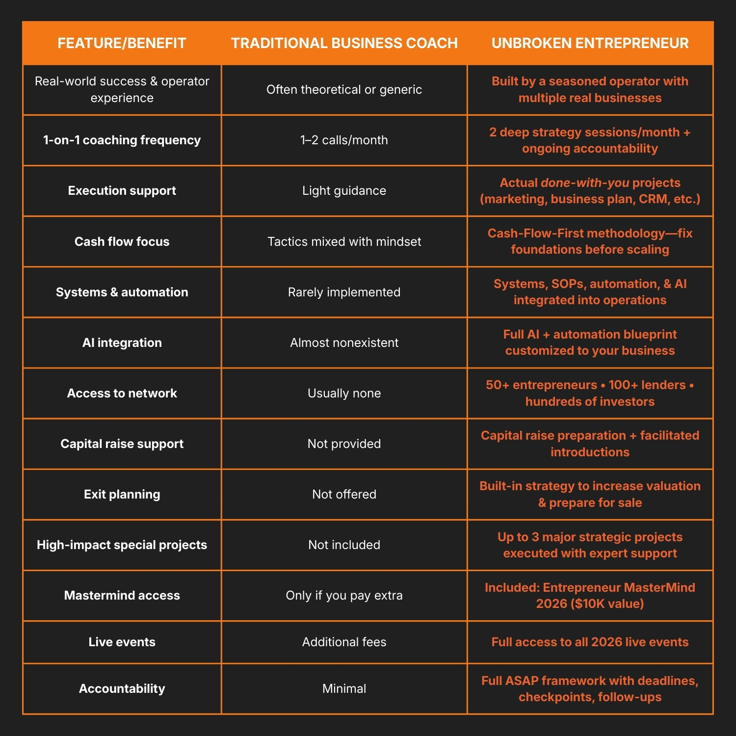 Unbroken Entrepreneur gives you 12 months of elite 1-on-1 business mentoring, access to hundreds of lenders and investors, high-leverage strategic projects, and the A.S.A.P Framework — a battle-tested method to drive fast, measurable progress in any business stage.